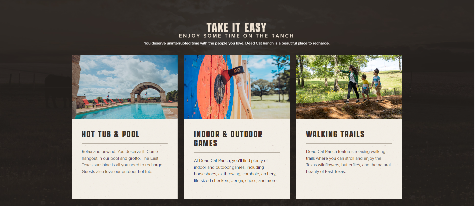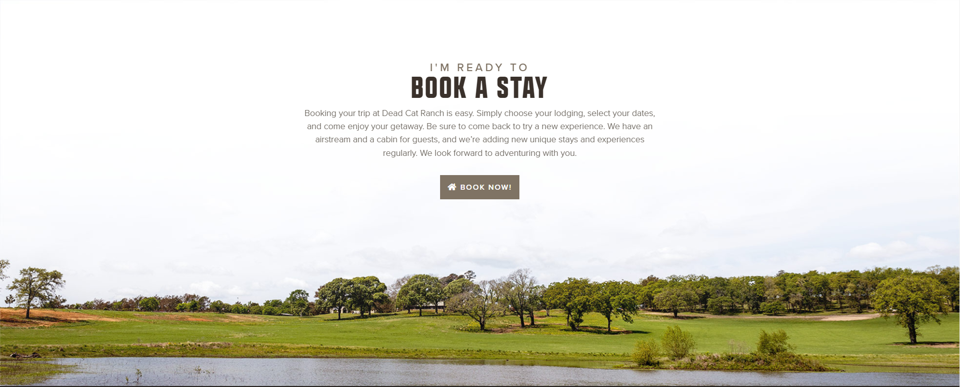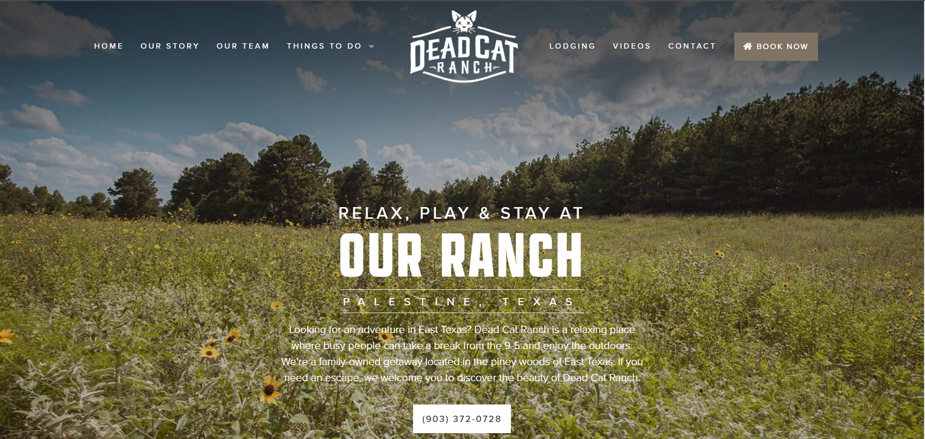 Primarily promotes Dead Cat Ranch and shows off the property, lodging and activitiesWarm and inviting, slightly mysteriousTalking to target audiences (men and women ages 25+)Easy to navigate design